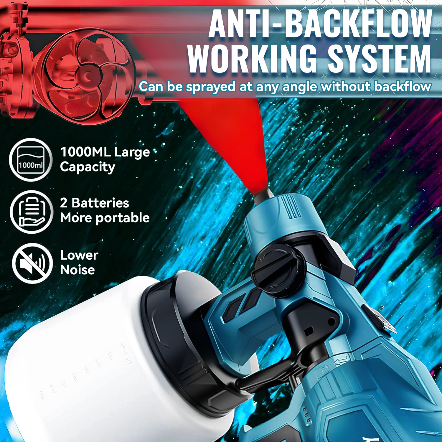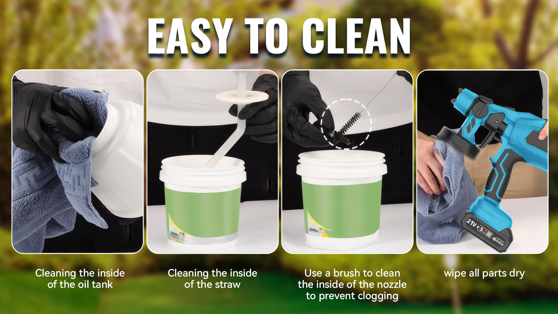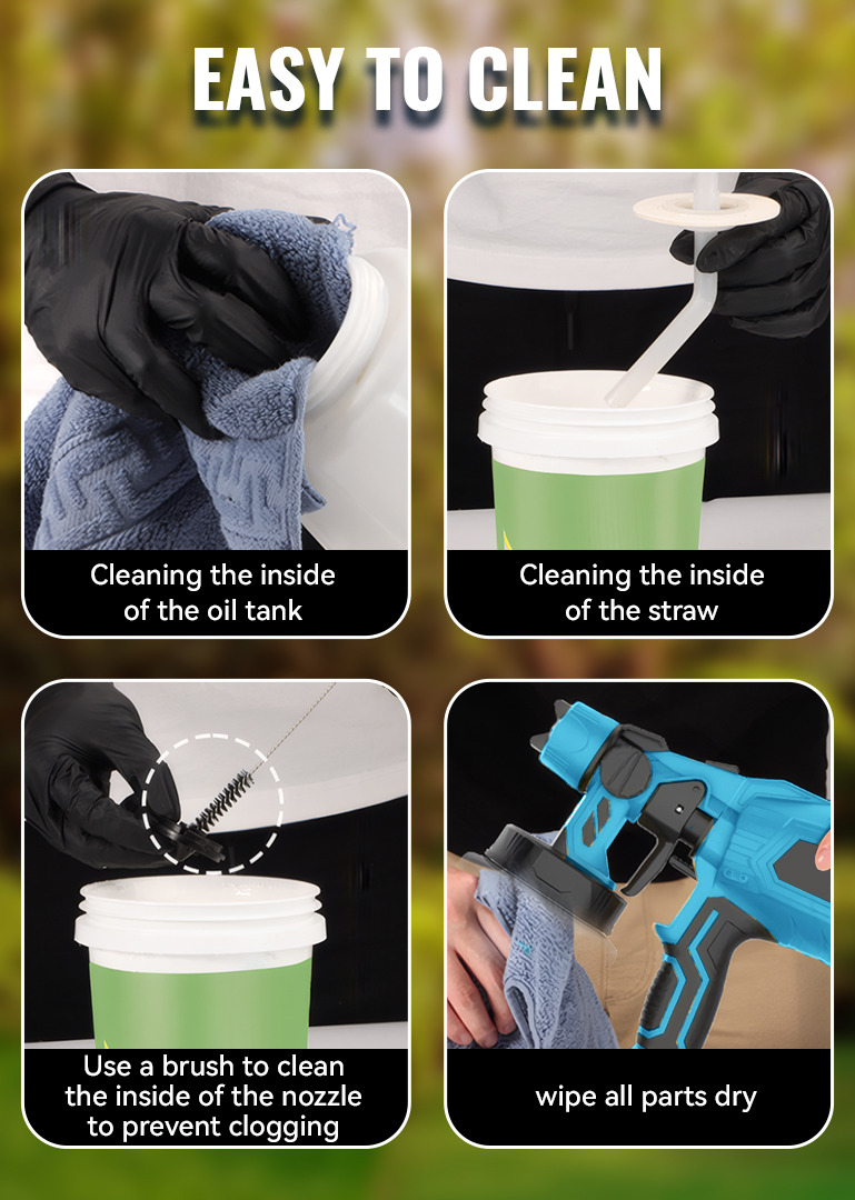When spraying, hold the gun 25–40 cm (9.8–15.8 inches) from the surface and adjust to achieve the best spray effect. It is easy to disassemble and reassemble, and can be cleaned with water or cleaning solution. Ensure the battery and the device itself remain dry during use and cleaning.