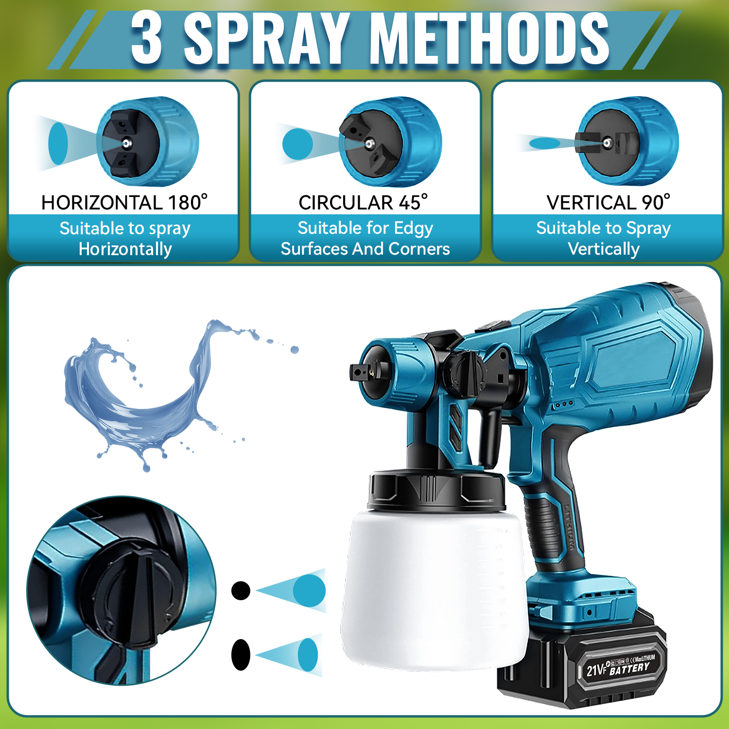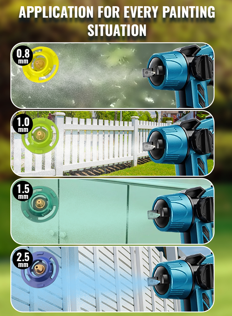 The paint sprayer is equipped with 4 nozzles (sizes: 0.8mm, 1.0mm, 1.5mm, 2.5mm). Smaller nozzles are suitable for fine spraying while larger nozzles are suitable for spraying large areas. The battery paint sprayer can be adjusted to 3 different spray patterns: horizontal, vertical and round, making it suitable for a variety of needs. After spraying, you need to clean the nozzle and spray bottle in time to prevent clogging.