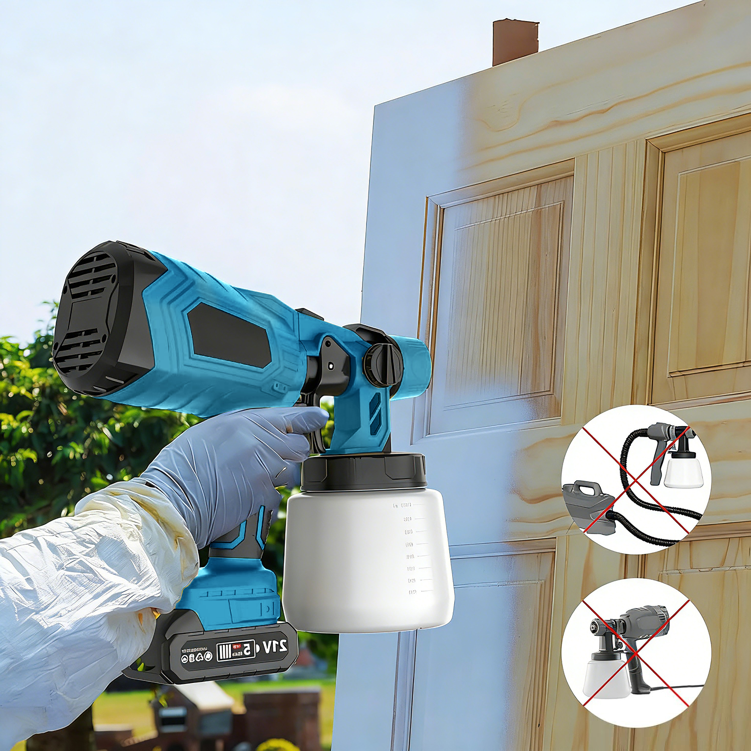The handheld cordless paint sprayer features a spray width knob that allows precise control of the spray area, significantly improving paint application efficiency. By adjusting the paint flow according to the project requirements, you can achieve better results while minimising paint waste, making it suitable for a wide range of spraying tasks.
