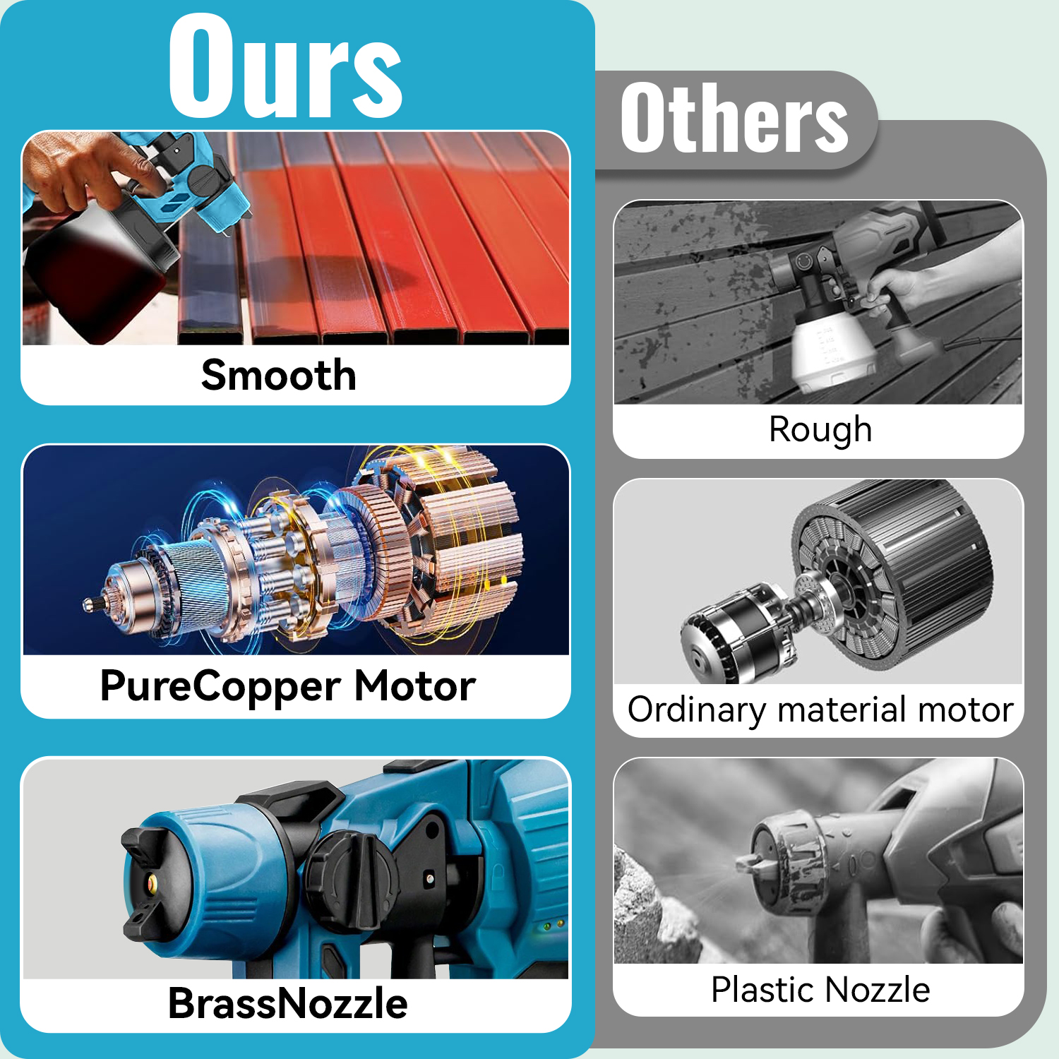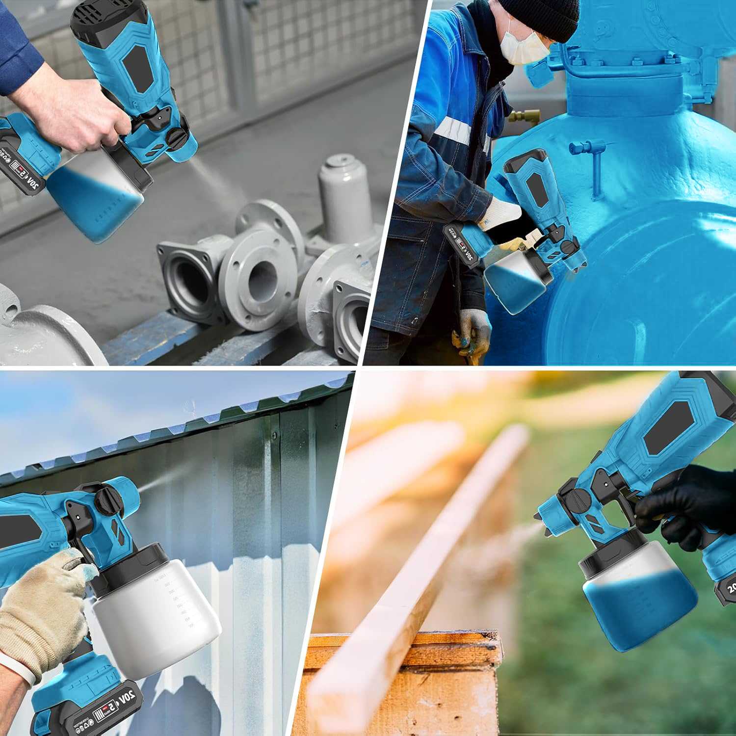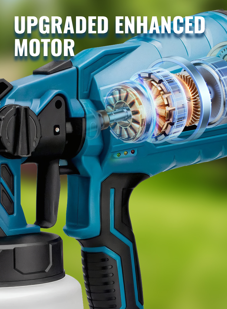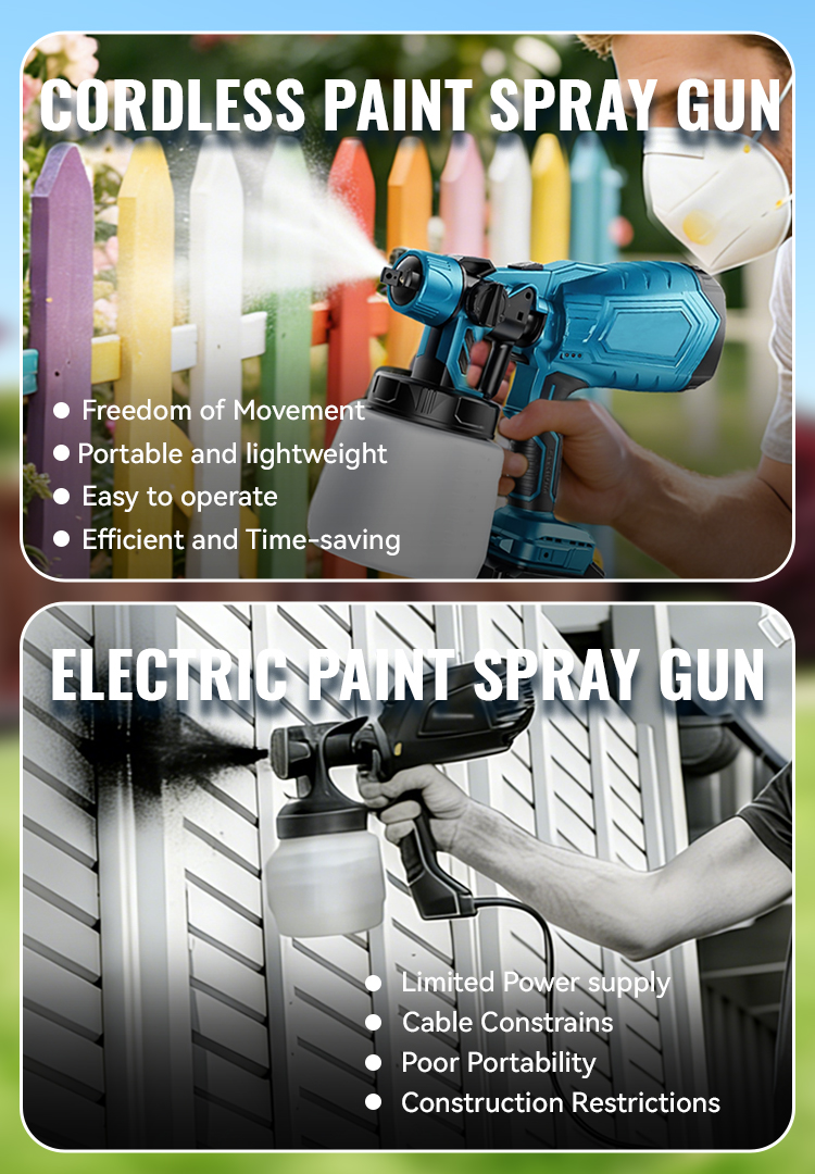 Our cordless paint sprayer comes with 2 x 3000mAh rechargeable batteries so it can operate continuously. The cordless sprayer is easier to carry and work with than the corded one. It is also more suitable for use in high or narrow places without worrying about short lines and tangled lines. Note: When fully charged, a single battery can be used for 10 minutes, 2 batteries can be used for 20 minutes.