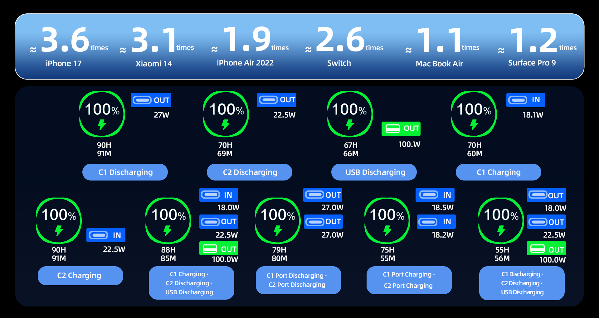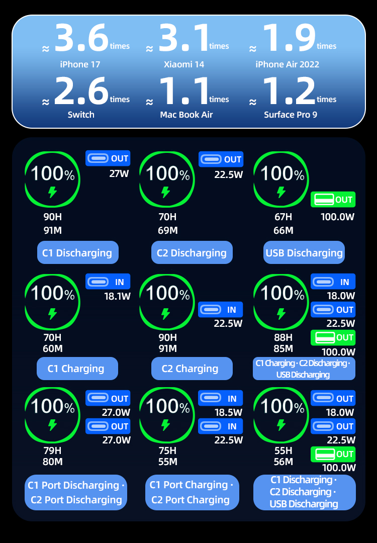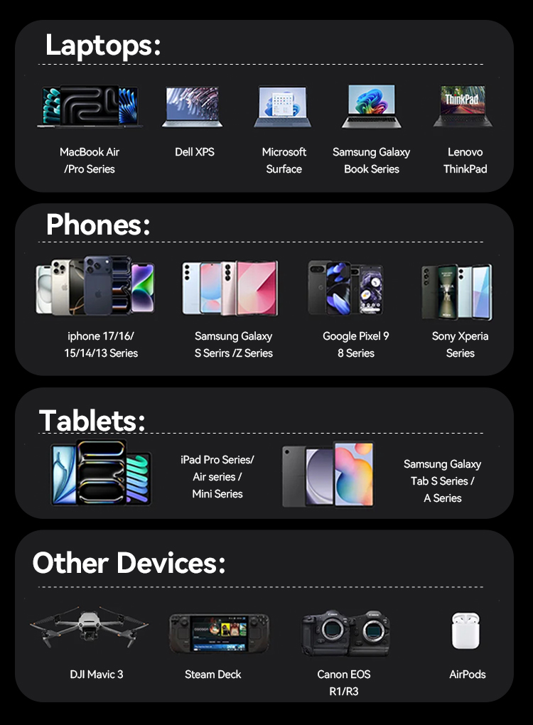 Designed for modern multi-device life, this power bank supports charging up to three devices simultaneously. With 2 input ports and 3 output options, it’s compatible with a wide range of fast-charging standards including PD2.0, PD3.0 and UFCS (up to 100W max), making it easy to power devices from different brands with confidence.