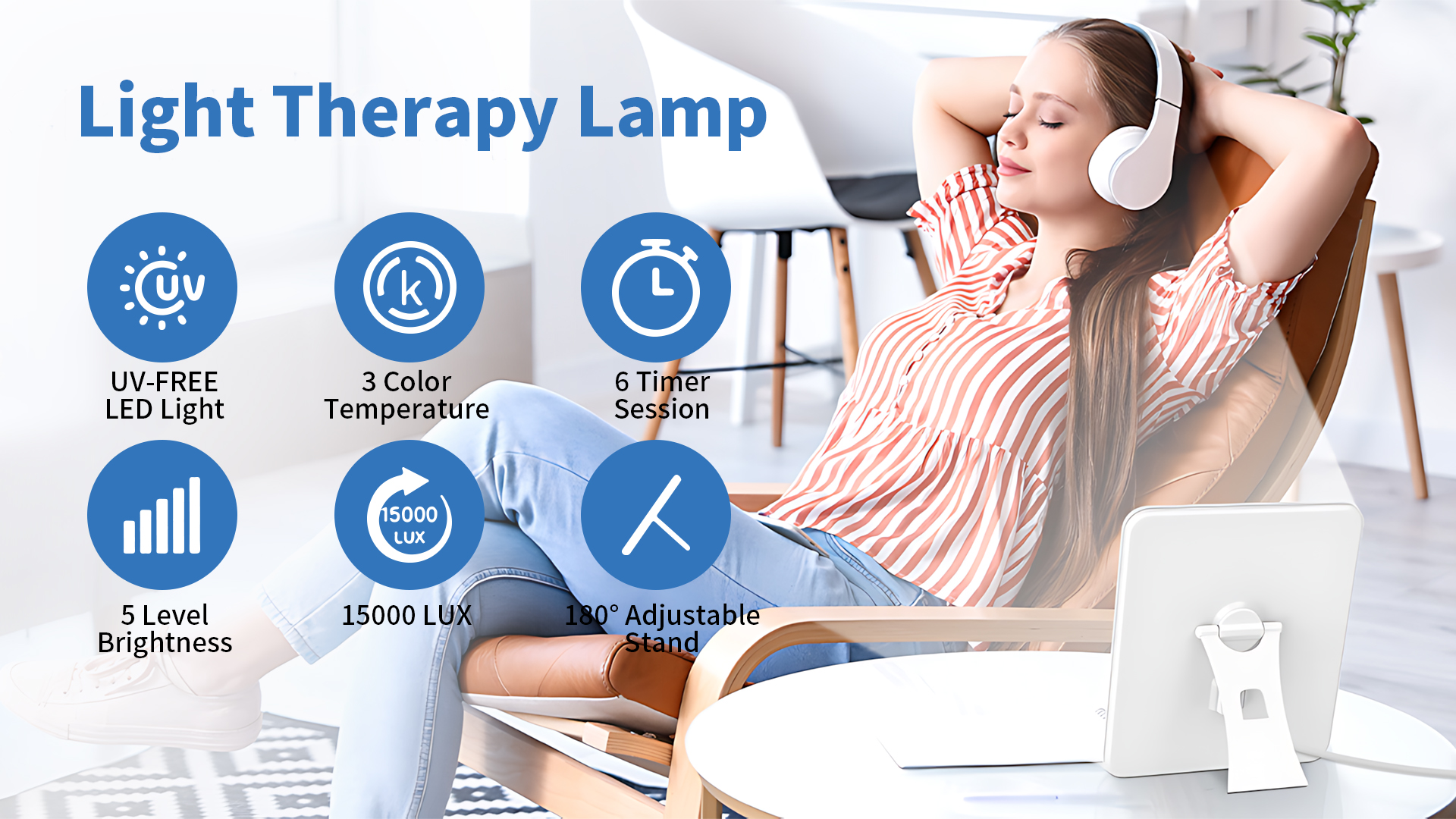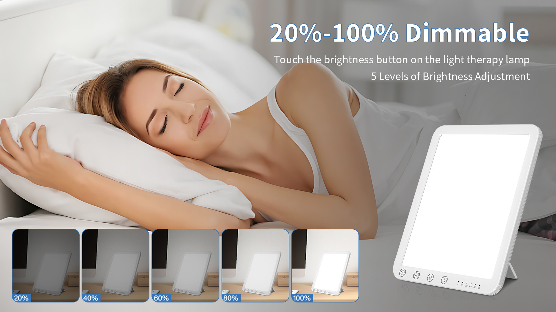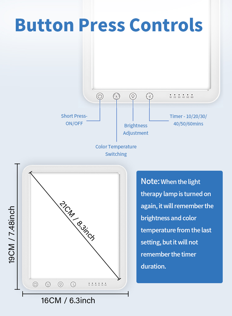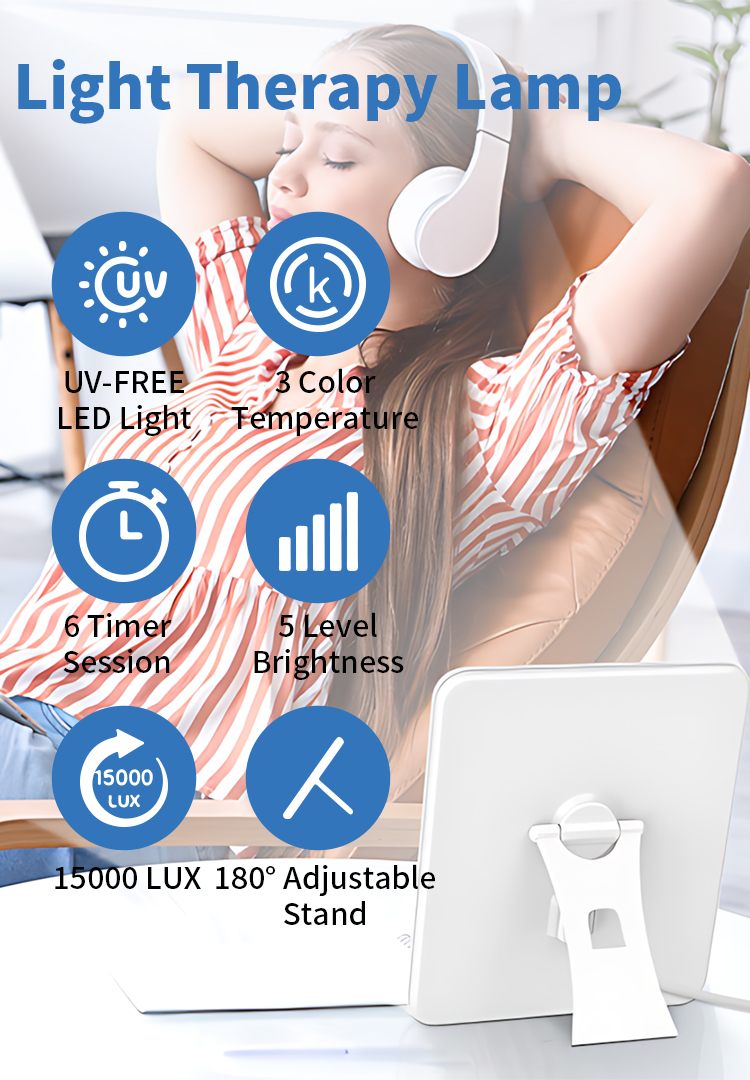 Our sun light therapy lamp offer 5 brightness levels (20%-100%) for maximum comfort and customization without hurting the eyes. This sun lamp is equipped with an Air-cooled Chip that the lamp at any time without it exceeding 36℃. This extends the life of the lamp and also ensures safety in use.